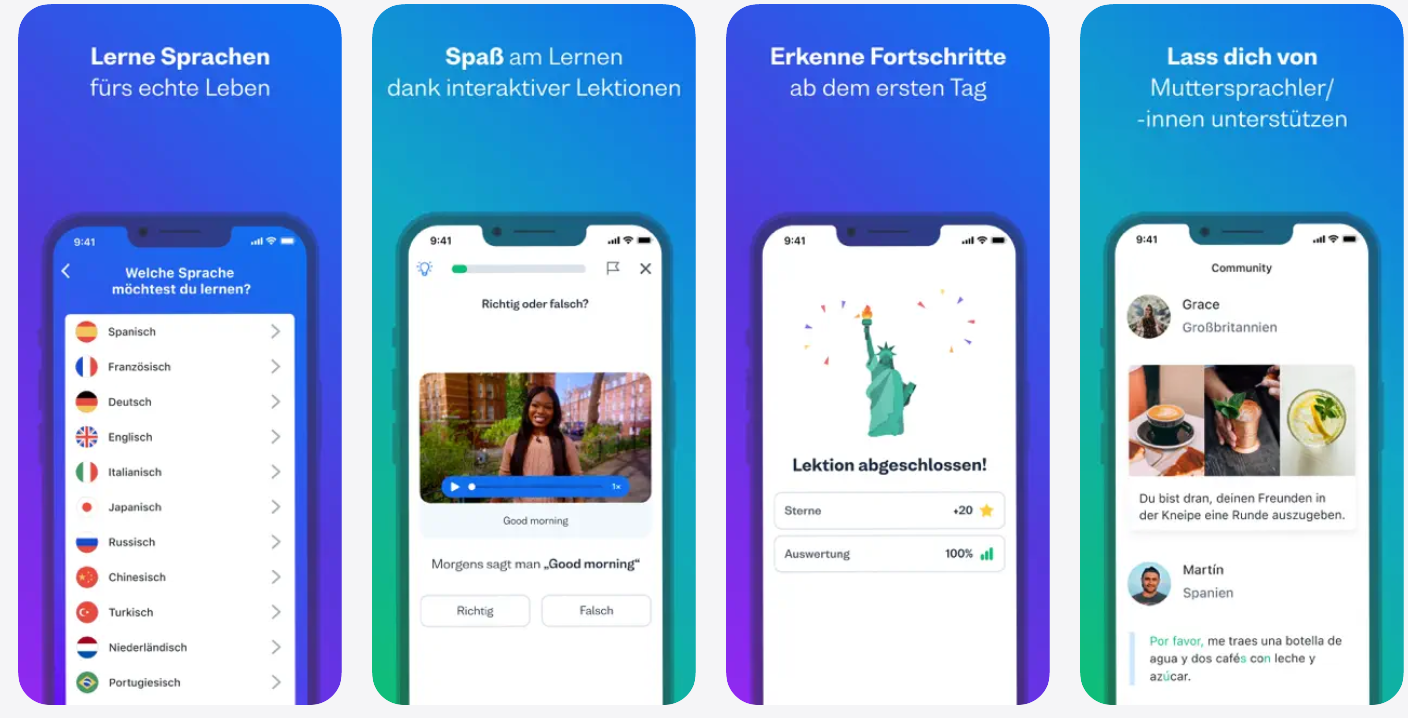 Busuu kombiniert Lerninhalte mit einer Community, die Texte korrigiert – sinnvoll für Schreibtraining.