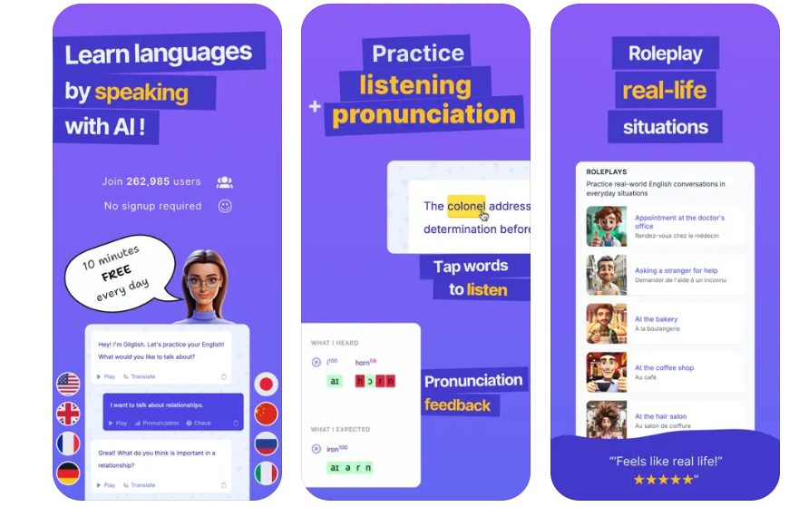 Giglish is a conversational AI app designed to help users improve their speaking skills through interactive dialogues and real-life scenarios.