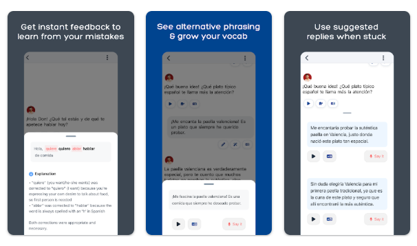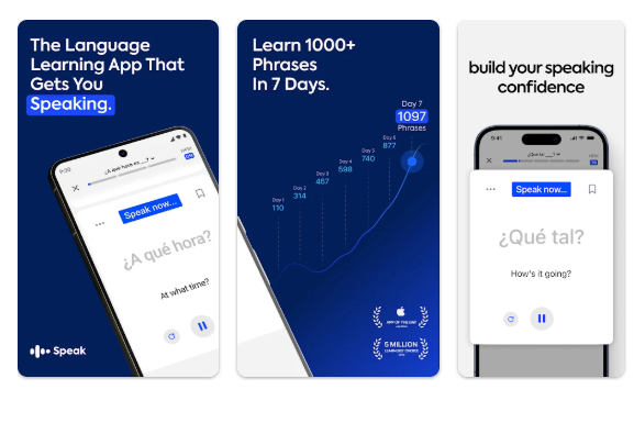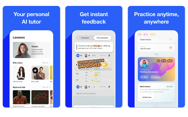 Speak is an AI-powered speaking app that replicates a human tutor experience through voice interaction. It emphasises pronunciation, fluency, and realistic conversations using human-like voices.