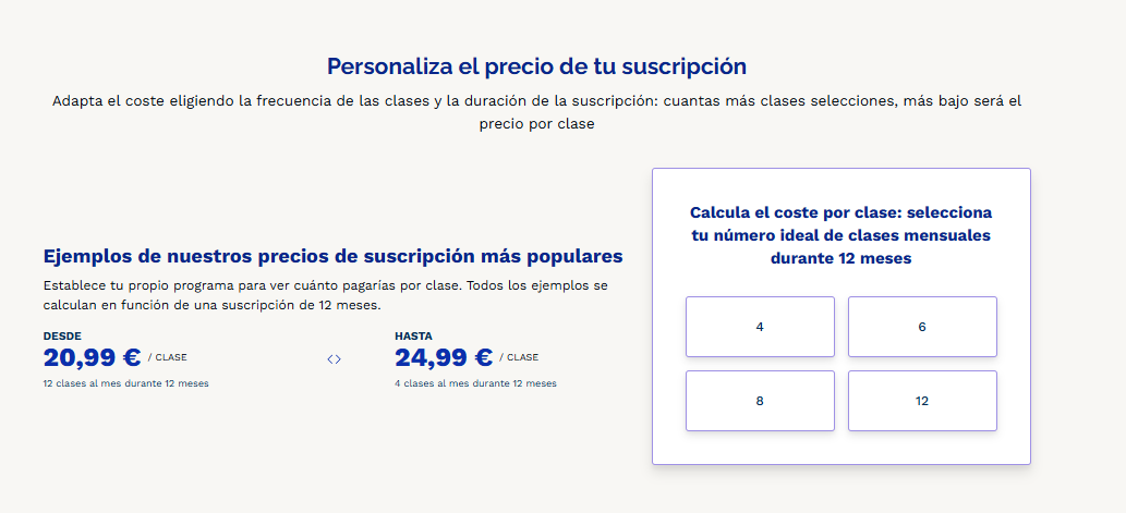 - Desde 20,99 € por clase si se contratan 12 clases al mes.